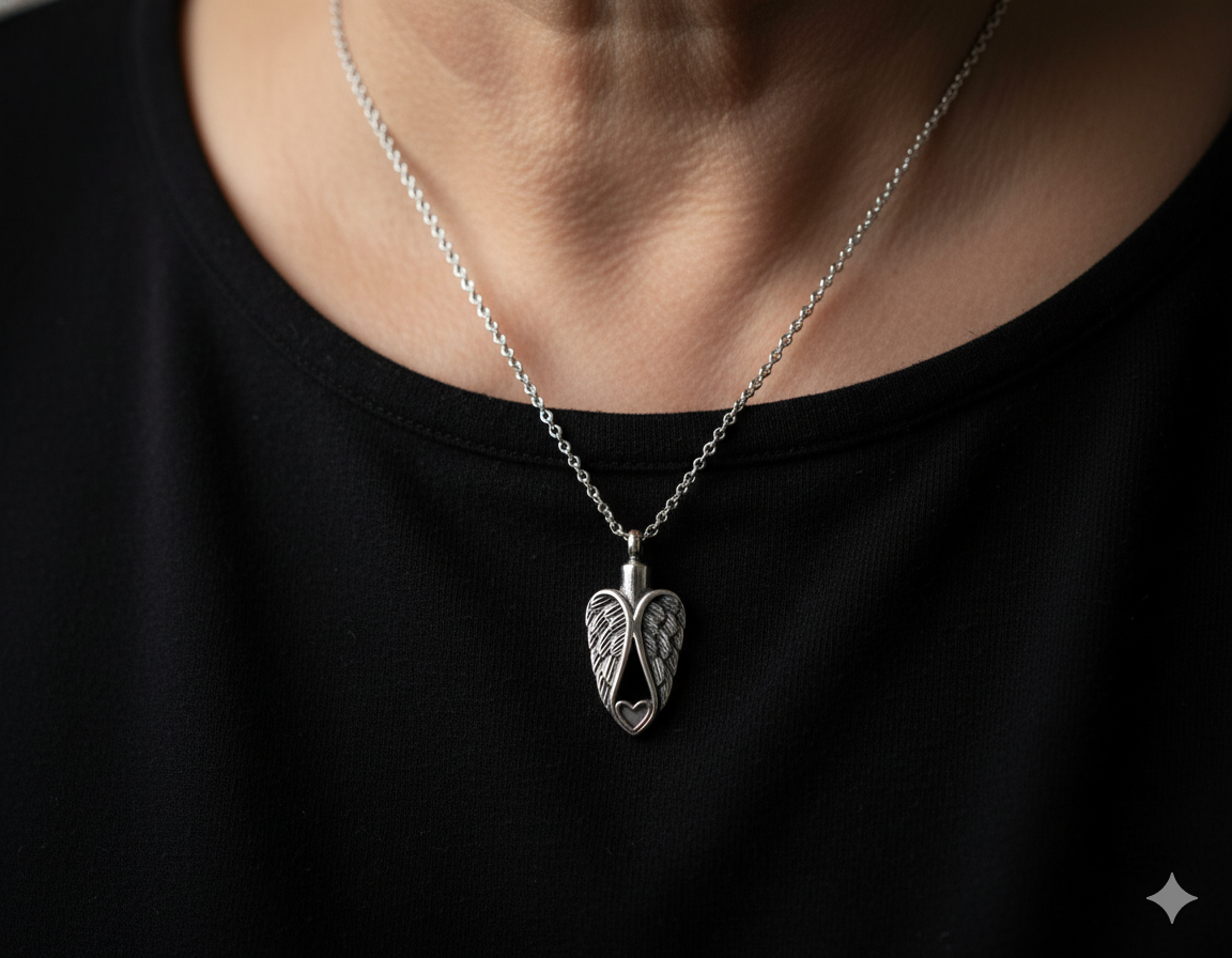 Wings of Love cremation jewelry is designed to hold a small portion of ashes, hair or dried ceremonial flowers. Pendant comes with stainless steel chain, a funnel kit and black gift box.